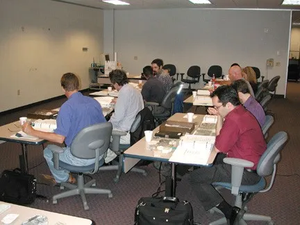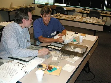 Typical classroom view showing participants with notebook and rock sets, as they work an exercise following a lecture.