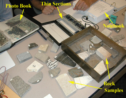 Lectures are reinforced with exercises that use rock samples of cores and outcrops, augmented by thin sections for each sample. Thin section photographs are organized into a 154-page rock catalog photo book. Each person uses and keeps the paper copy of the photo book of hand sample & thin section photographs (valuable reference later on!).