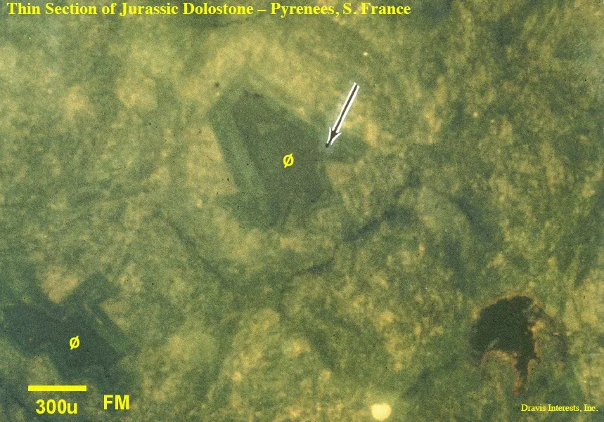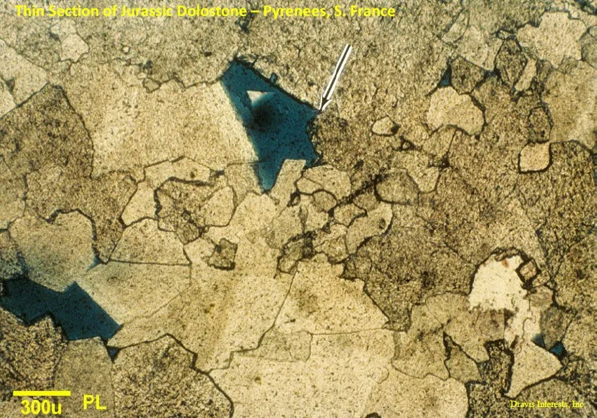 A. Thin section photomicrograph of a Jurassic dolostone gas reservoir from southern France taken with standard plane-polarized light. Secondary pores are filled with blue-dyed epoxy resin. In this view, the primary depositional composition and texture, the timing of dolomitization, the origin of the porosity and the timing of porosity development cannot be resolved. Arrow points to the same spot as in B. Compare to B.