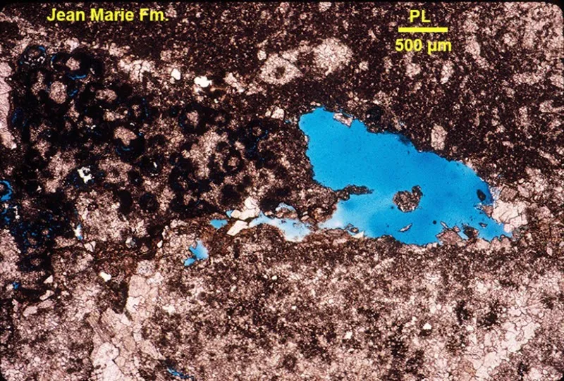 A. Thin section photomicrograph of a Devonian gas-bearing limestone from the Jean Marie Formation in British Columbia, Canada. The timing of the formation of the blue secondary porosity is not apparent. Compare to B.