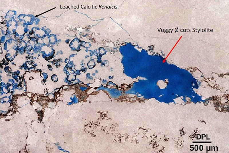 B. Thin section photomicrograph and same view as in A but taken with diffused plane-polarized light (simple “white paper technique”). This view reveals blue secondary porosity associated with leaching of calcitic microfossils called Renalcis. It reveals the presence of pressure solution seams, one of which was cut by secondary vuggy porosity. The porosity in this view was created by deeper-burial dissolution.